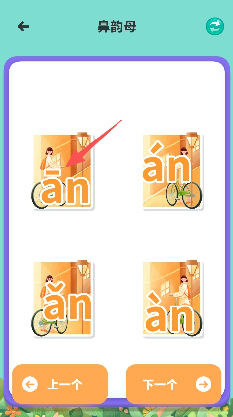 2、在鼻韵母板块,查看不同声调的鼻韵母,学习声调变化。