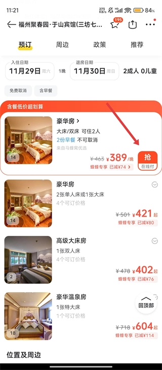 3、我们可以在酒店详情页选房型,点击房型旁的【抢】按钮进入预订页哦。