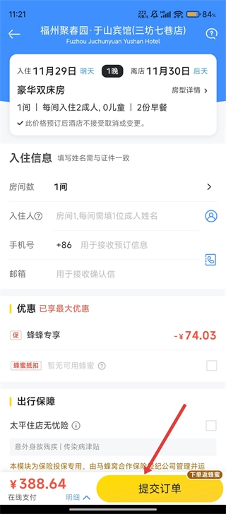 4、我们需要填写入住信息,确认金额后点击【提交订单】完成预订吧。
