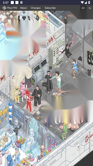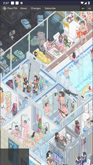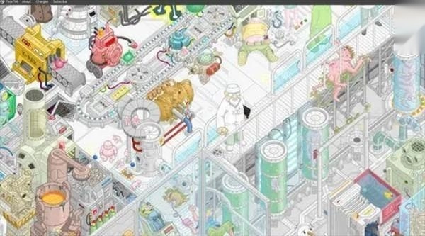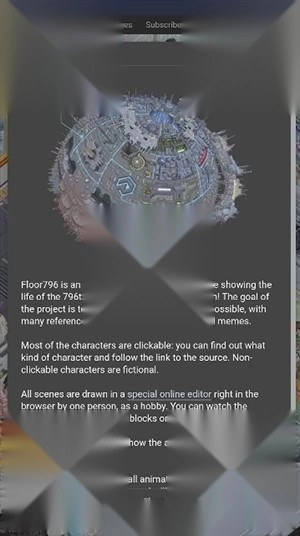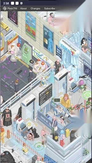 1、当打开Floor796的页面时,浏览器上显示了以5秒间隔重复动作的循环视频。场景似乎设定在“巨大空间站的796层”,各种东西,如怪异的生物、培养设备、科学家看着它们、修理系统的工程师等,都在屏幕的边缘移动。