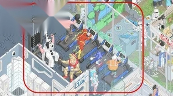 6、在健身房,闪电侠、刺猬索尼克在跑步机上并肩奔跑。