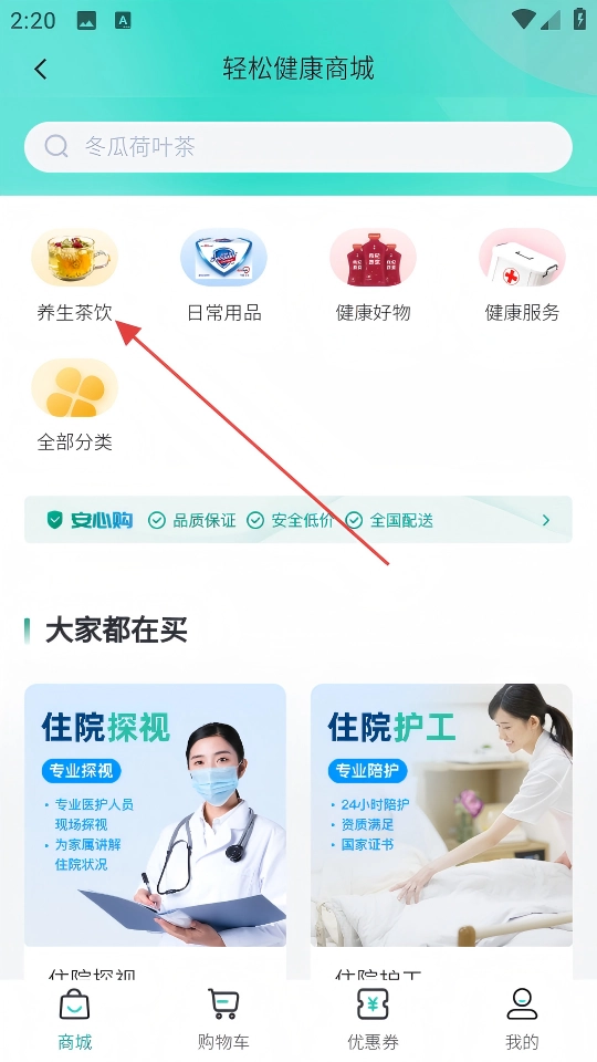 2、在【轻松健康商城】页面,点击【养生茶饮】分类,进入养生茶饮的商品列表页面。