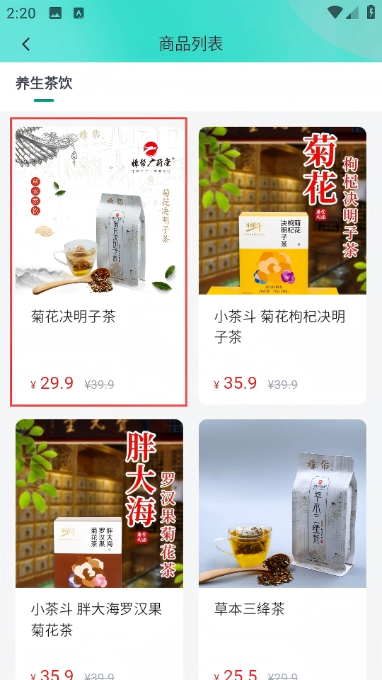 3、在【商品列表】页面,选择目标商品如【菊花决明子茶】,进入该商品详情页。