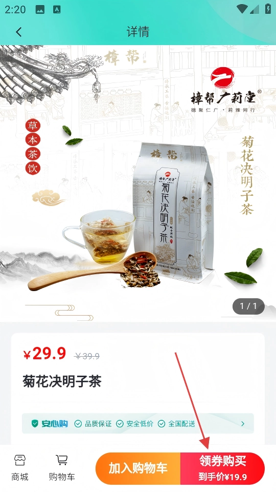 4、在商品详情页,点击【领券购买】按钮,即可完成该养生茶饮的购买操作。