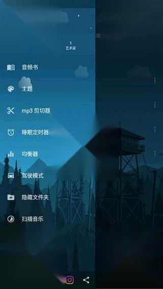 在左上角的三道横杆中,可以查看当前歌曲、专辑和艺术家的数量,同时音频书、主题、mp3剪切器、睡眠定时器、均衡器以及驾驶模式、隐藏文件夹、扫描音乐和基本设置、常见问题都能在此界面中进行自定义修改。