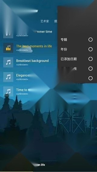 在相同的上部菜单栏中,用户还能点击放大镜一样的图标进行音乐搜索,下一个功能则可以按照首字符进行正序和倒序的查找,或按照艺术家、专辑、年份、已添加日期、日期已修改和作曲者进行精准查找。