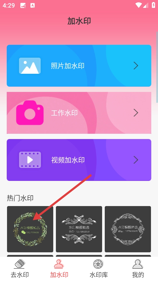3、在加水印页面,选择心仪的热门水印模板,进入水印详情页。
