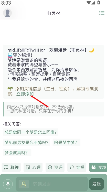 2、在“心灵微光指引”板块中,可输入关键词发送消息,系统会根据主题呈现文字或语音形式的心灵指引内容。