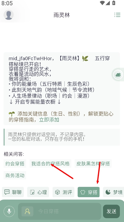 3、打开“穿搭”板块后,可输入与自身特征或需求相关的问题,系统将展示适合的穿搭风格建议与搭配灵感参考。
