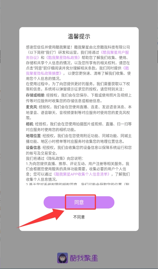 1应用启动后,请仔细阅读温馨提示,确认内容无误后点击同意选项。