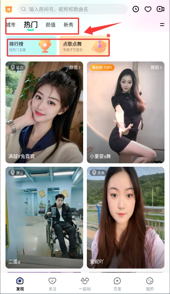 3、进入主页面后,可按城市或热门分类进行浏览,从中挑选感兴趣的主播房间进入观看。