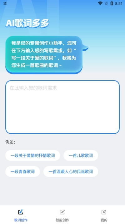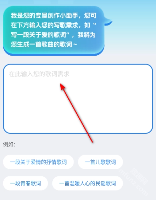 1、进入ai歌词多多软件,在这里输入歌词需求
