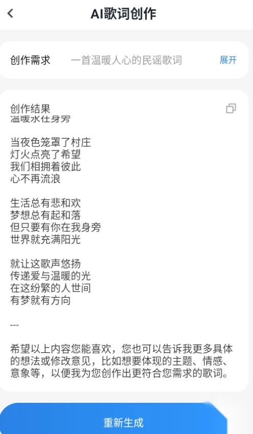 AI助手能在创作过程中提供新的思路和灵感,帮助用户更好地完成歌词创作。
