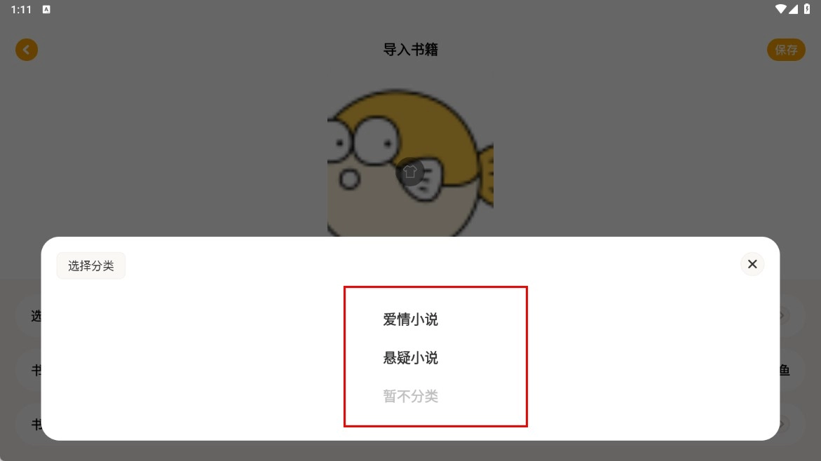 3、选择文件后,选择书籍分类,如【爱情小说】【悬疑小说】或【暂不分类-分类选项】。