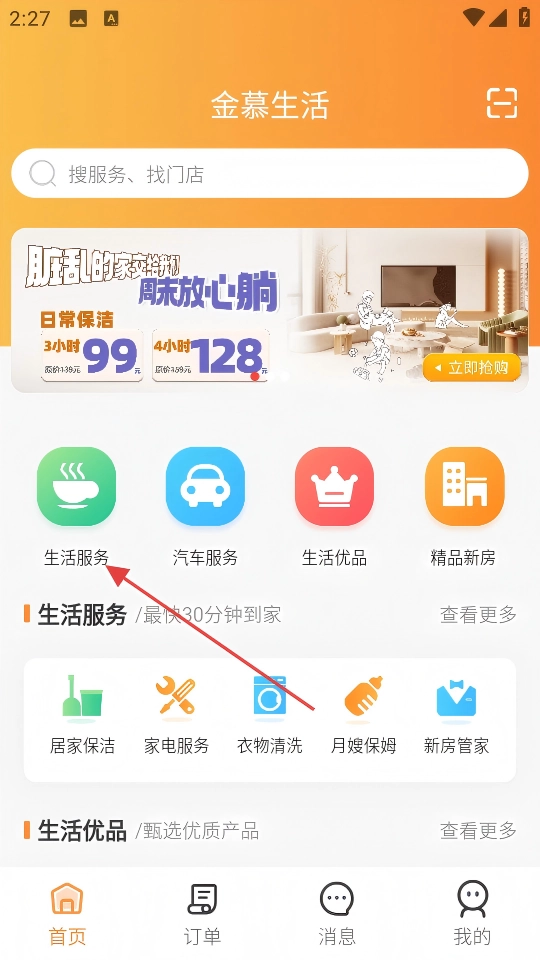 1、在“金慕生活”首页点击【生活服务】,进入生活服务分类页面。