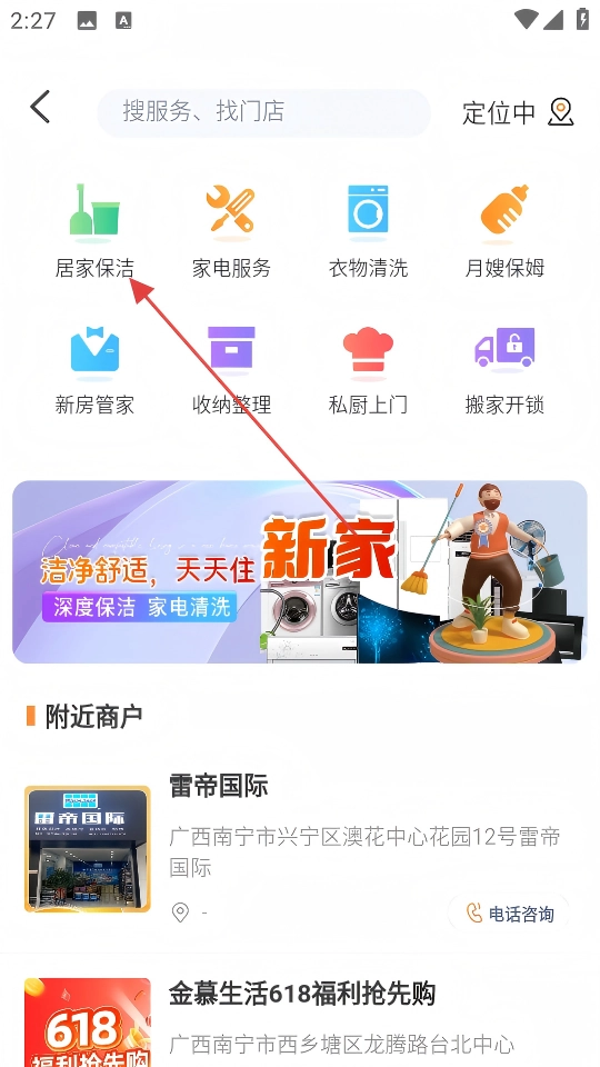 2、在生活服务分类页面点击【居家保洁】。
