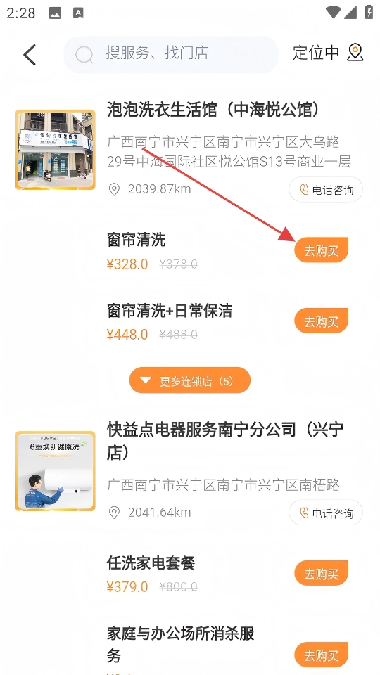 3、进入相关服务列表,找到【窗帘清洗】服务,点击“去购买”。