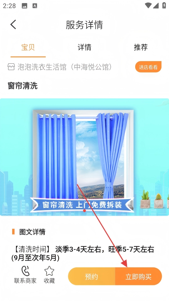 4、进入窗帘清洗服务详情页,可查看服务内容,点击【立即购买】。