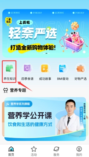 1、启动应用后,在首页选择"健康养生"功能进入知识学习专区。