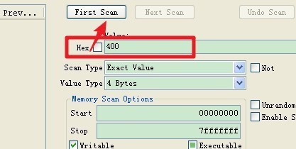 4在标有“Hex”的输入区域填入数值400,接着点击“first scan”按钮执行操作。