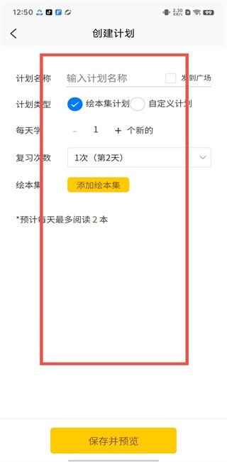 第二步,按照要求输入计划名称、计划类型,并添加绘本,完成这些操作后即可保存。