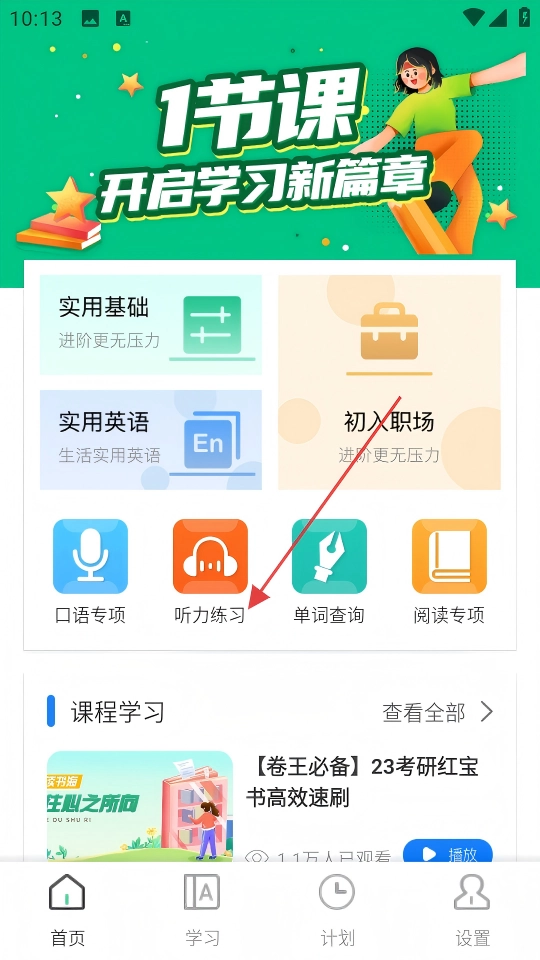 1、在软件首页点击【听力练习】,进入听力专项页面。