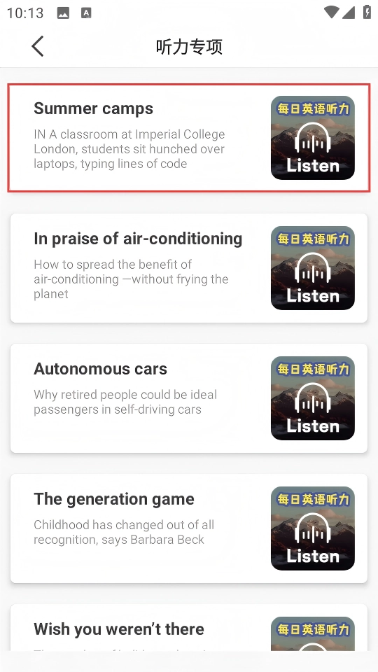 2、在听力专项页面选择【Summer-camps】文章,进入该文章的原文页面。
