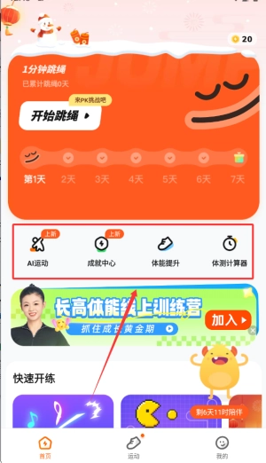 2、首页区域呈现智能运动模式、荣誉成就、体能进阶及身体指标测算工具。