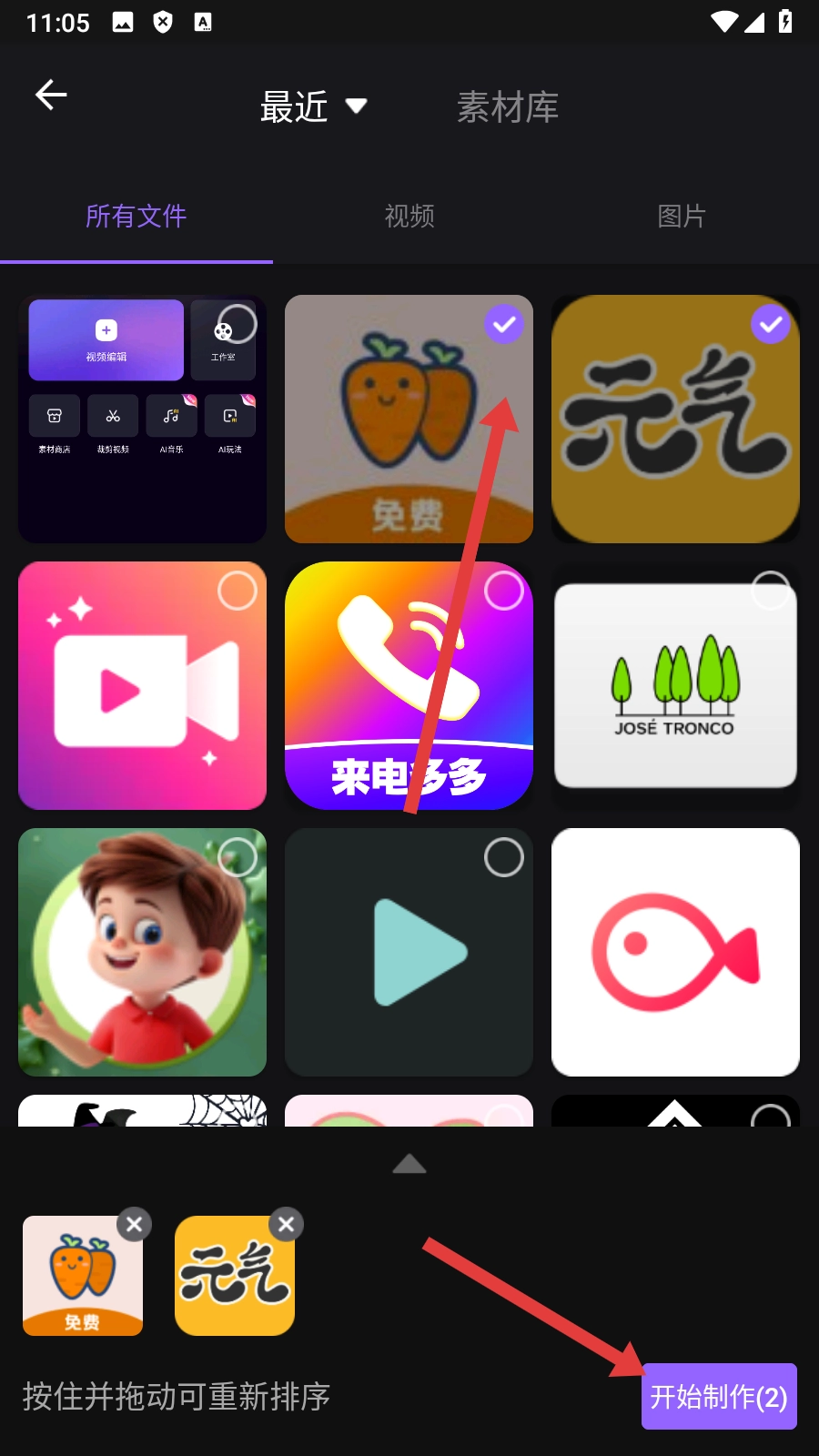 2、在视频素材选择页面【选择目标素材】后点击【开始制作】,进入视频编辑页面。
