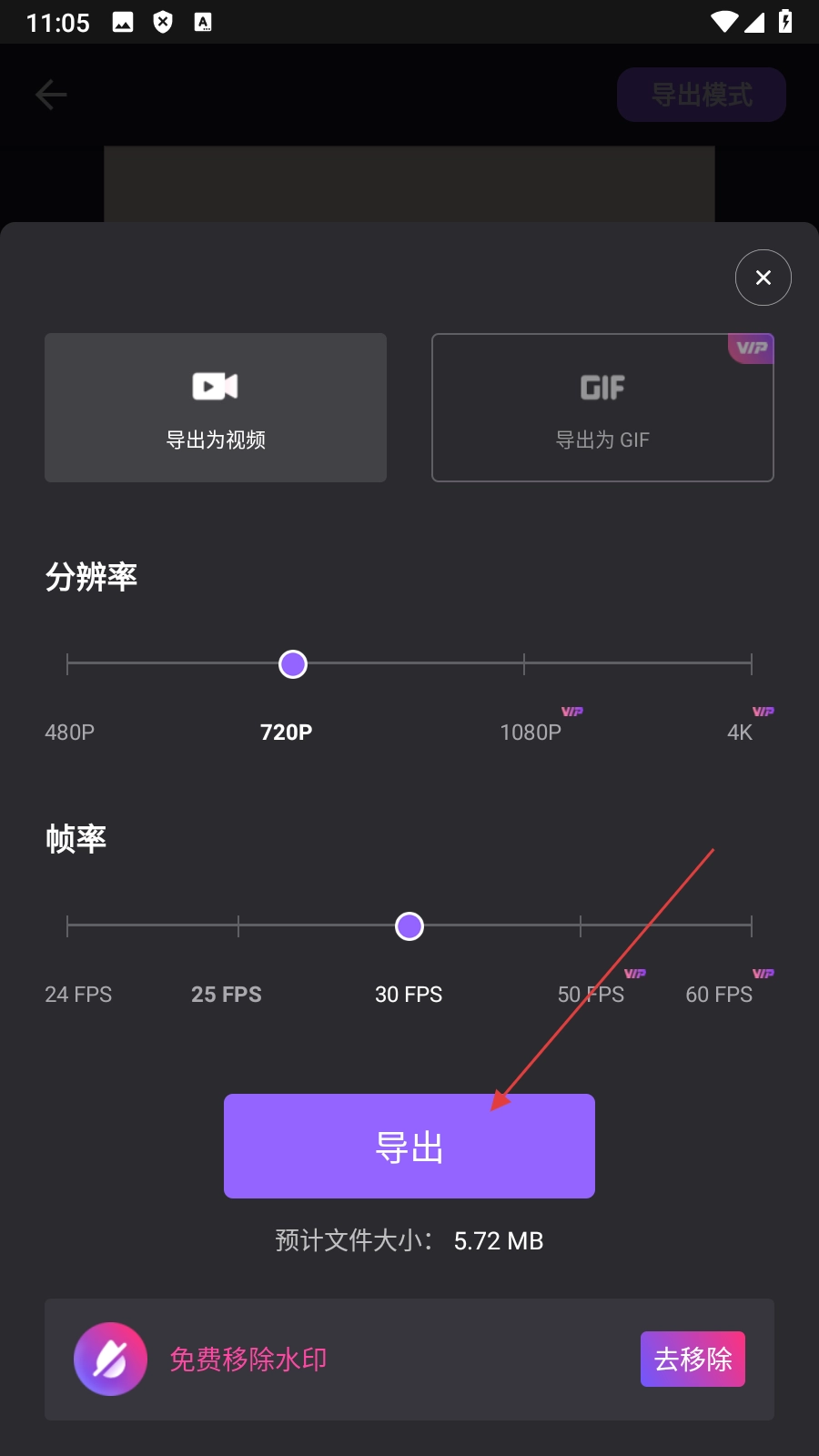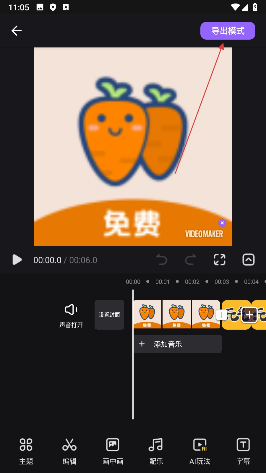 3、在视频编辑页面,点击【导出模式】,展开导出设置选项。