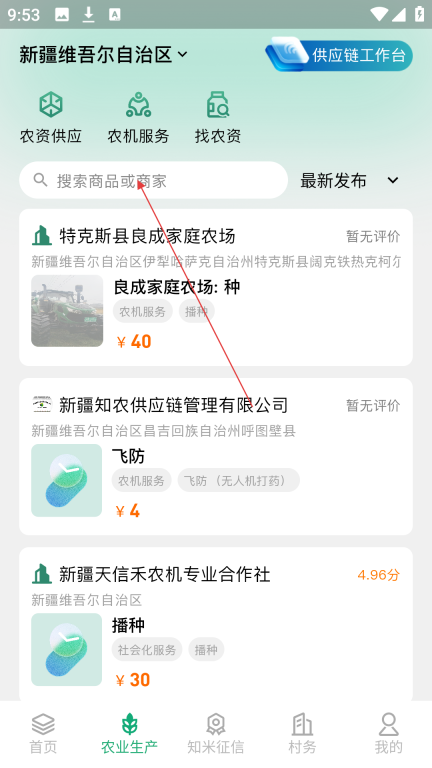 2在农业生产专区的搜索区域输入内容,以此来查找所需的农业相关服务或商品。