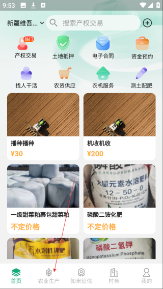 1打开农业服务类应用后,找到底部导航栏中的“农业生产”选项并点击,即可进入对应的功能专区。