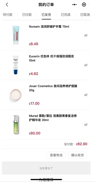 在购物车底部,系统会提示当前添加的商品总金额是否达到了可享受包邮优惠的60英镑门槛。