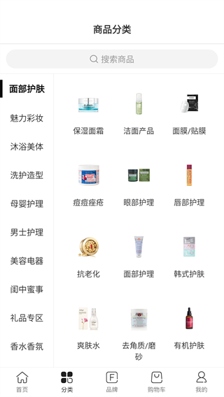 4、在分类页面能够浏览到各类商品,涵盖面部护肤、魅力彩妆等品类