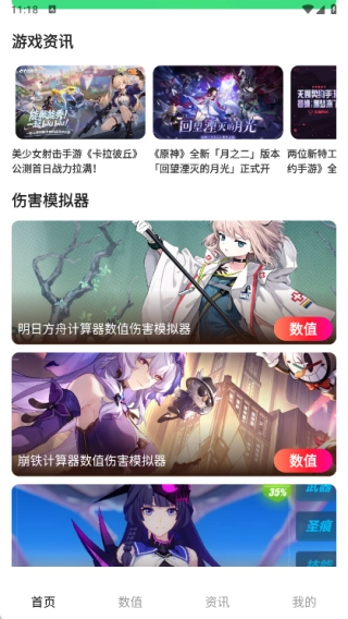 1、在首页中提供了游戏资讯和伤害模拟器,还有热门资讯等内容;