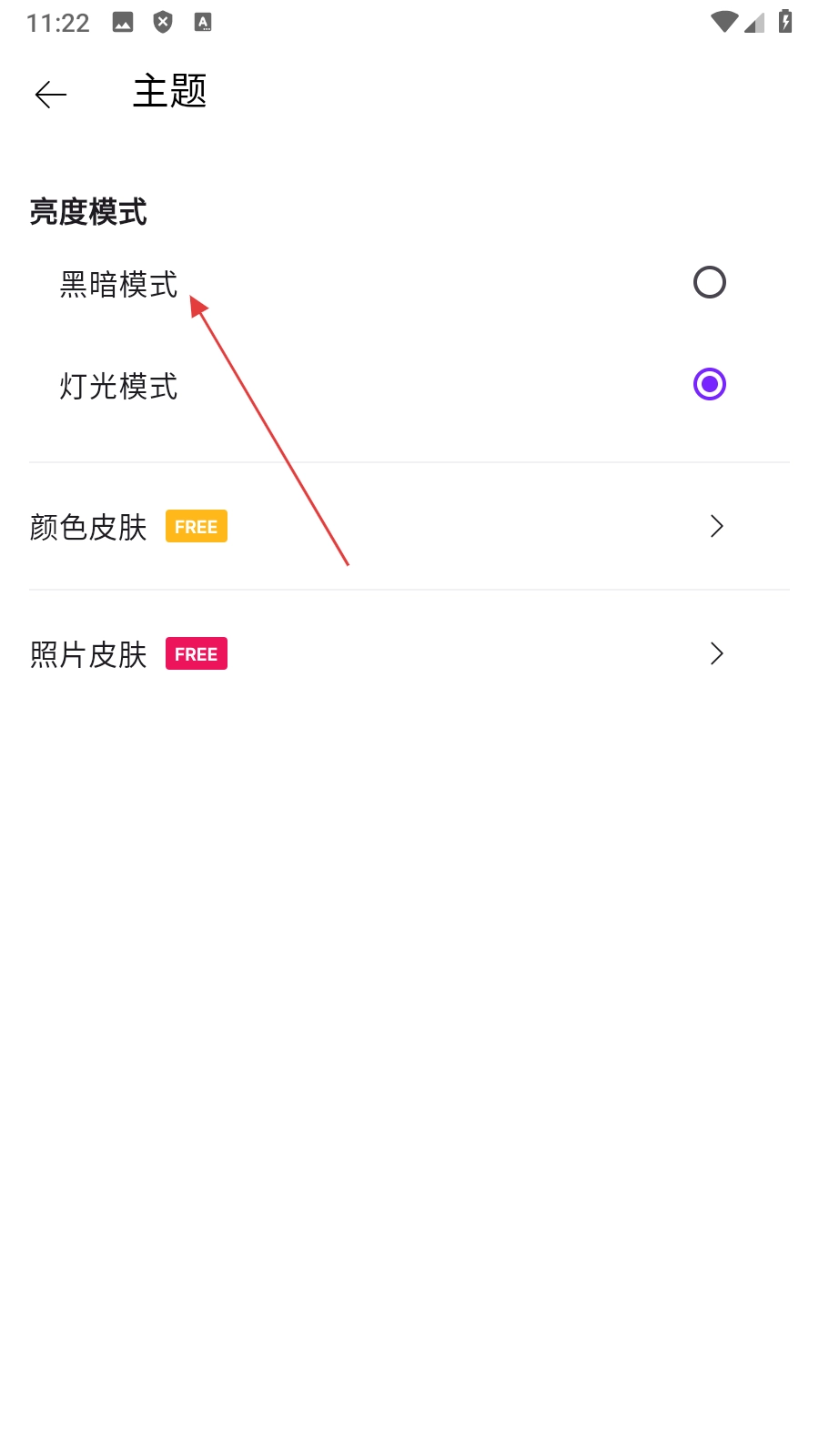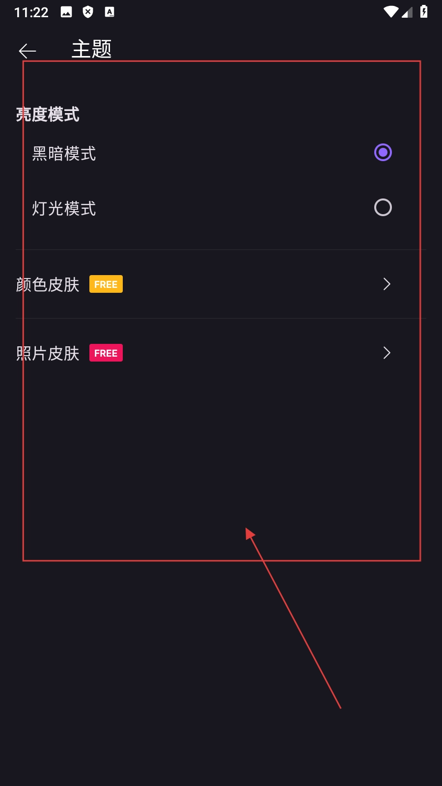 3、在主题设置页面,点击【黑暗模式】,选择黑暗模式选项。