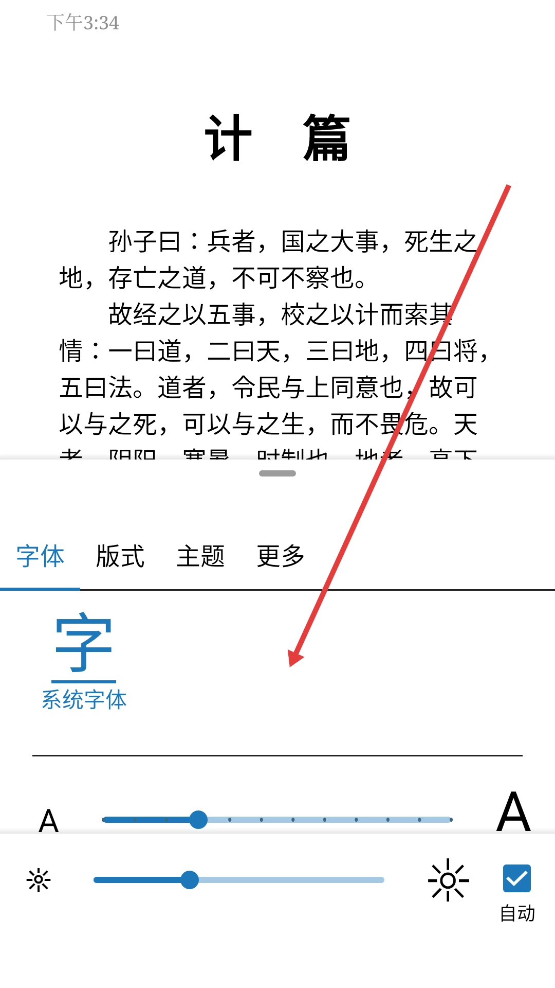 4、在字体设置界面可调整字体、版式、主题等,完成设置以优化阅读体验。