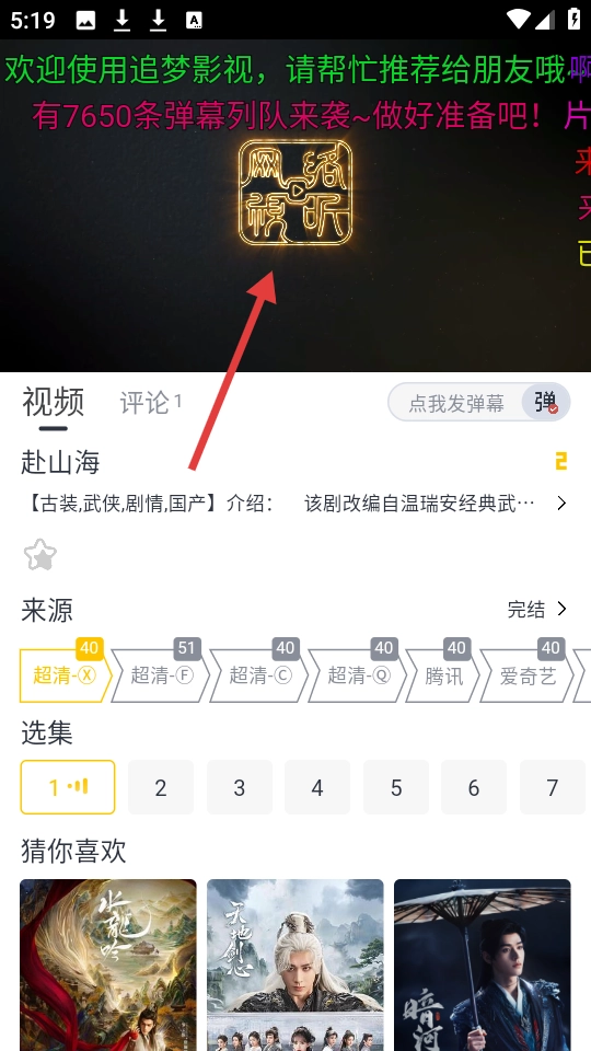 4、在【追梦影视】中,找到【赴山海】剧集,可选择超清等画质和不同选集观看,还能发弹幕互动。