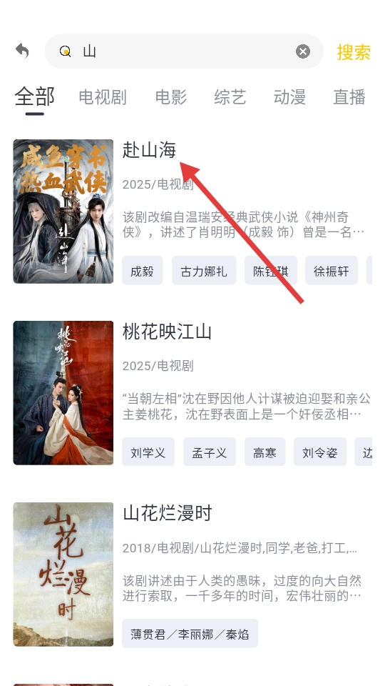 3、【搜索】后,即可找到【赴山海】等相关影视剧。