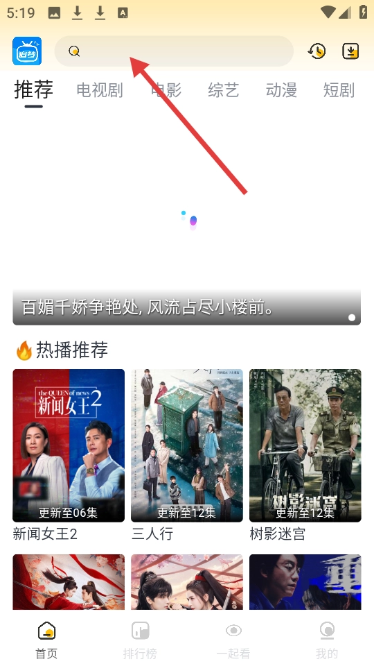1、点击应用顶部搜索栏,输入关键词可搜索影视内容。