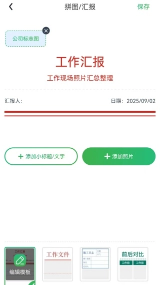 3、工程项目人员可以将每日施工现场不同角度、不同工作环节的照片,按照拼图汇报的固定布局进行整合。