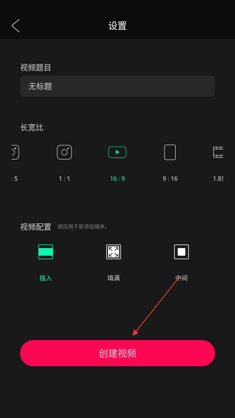 3、在设置页面,点击【创建视频】,进入视频编辑页面。