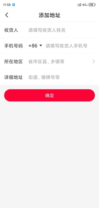 4、进入添加地址的界面后,依次填写收货人姓名、手机号码、所在地区以及详细地址,填写完成后点击【确定】按钮。