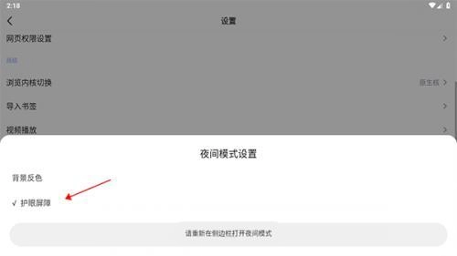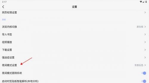 3、我们需要在设置中点击夜间模式设置,点击右侧的背景反色功能;