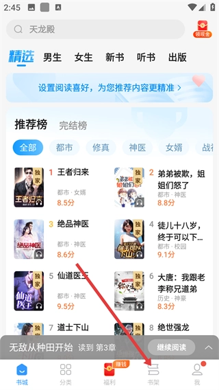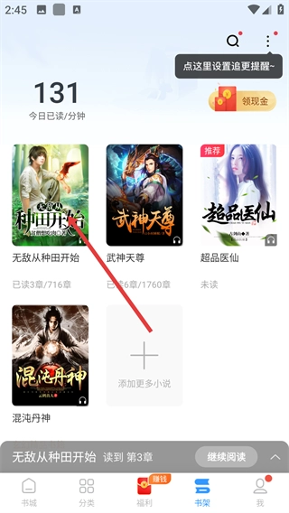 2、在书架页面,点击【无敌从种田开始】书籍,可查看其阅读进度,方便继续阅读。