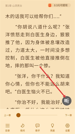 3、在阅读页面,点击右侧【听】按钮,可开启听书功能,切换为音频阅读模式。