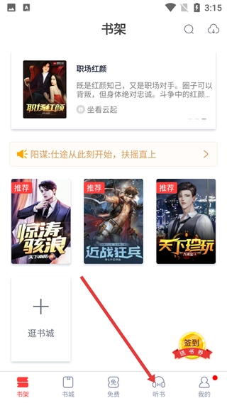 1在书架页面,点击底部的“听书”按钮即可进入听书页面,该页面会呈现人气作品、热播书籍等各类听书内容。