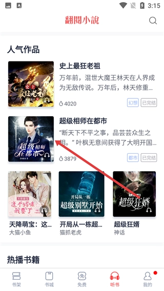 2、在听书页面的人气作品区域里,找到《超级相师在都市》并点击,即可进入该作品的专辑详情页面。
