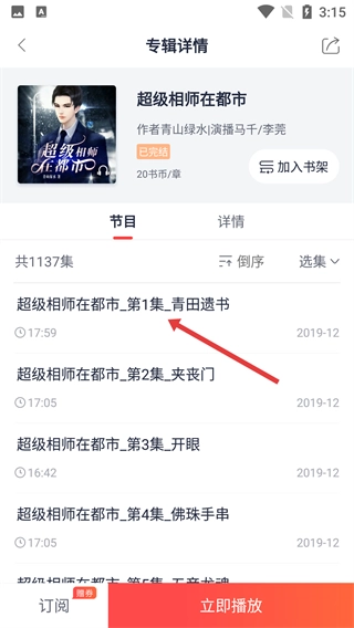 3、进入专辑详情页面后,找到并点击“超级相师在都市_第1集_青田遗书”这一选项,即可进入播放准备界面。