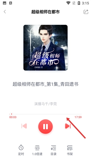 4进入播放界面后,就能开始收听《超级相师在都市》第一集的内容,同时也可以进行定时、倍速等播放设置。